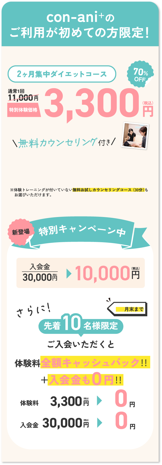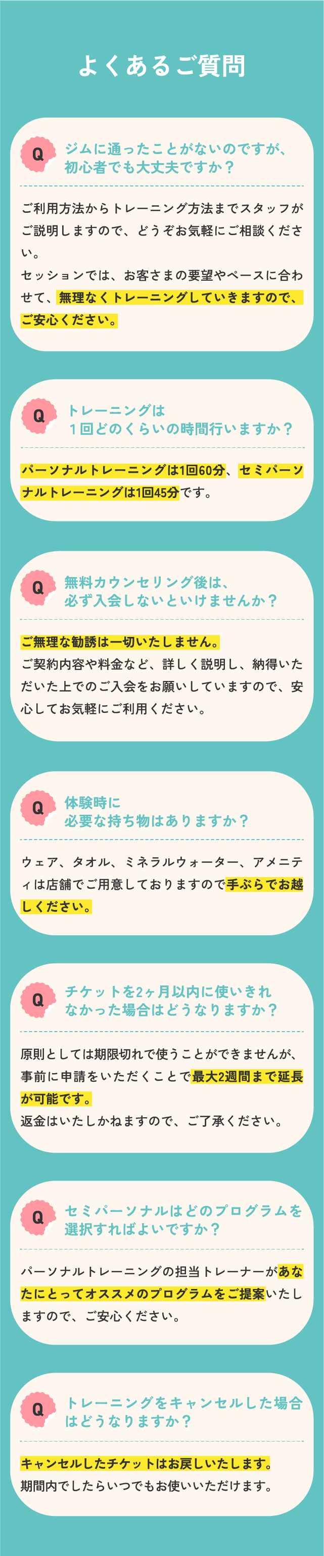 所要時間はカウンセリングのみは30分、トレーニング込みの場合は75分です。