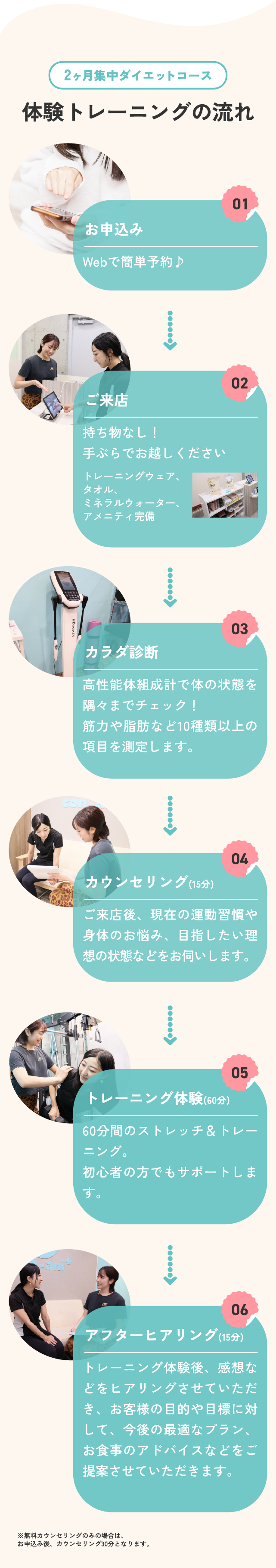 所要時間はカウンセリングのみは30分、トレーニング込みの場合は75分です。